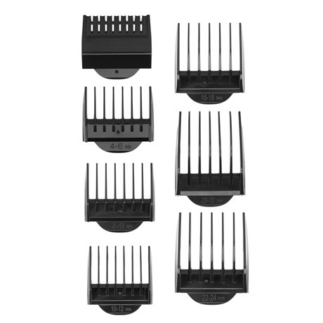 • 6 cserélhető fésű-feltét (4-6 mm, 7-9 mm, 10-12 mm, 16-18 mm, 22-24 mm, 28-30 mm)