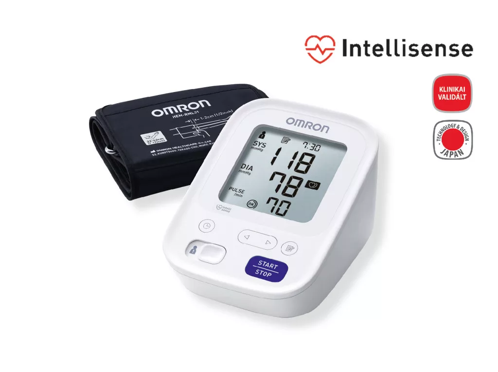 Intellisense mérési technológia - Minden OMRON vérnyomásmérő szabadalmazott logikai algoritmussal rendelkezik, vagyis a mandzsettafelfújás személyre szabott, fájdalom nélküli, szemben a hagyományosautomata vérnyomásmérőkkel.